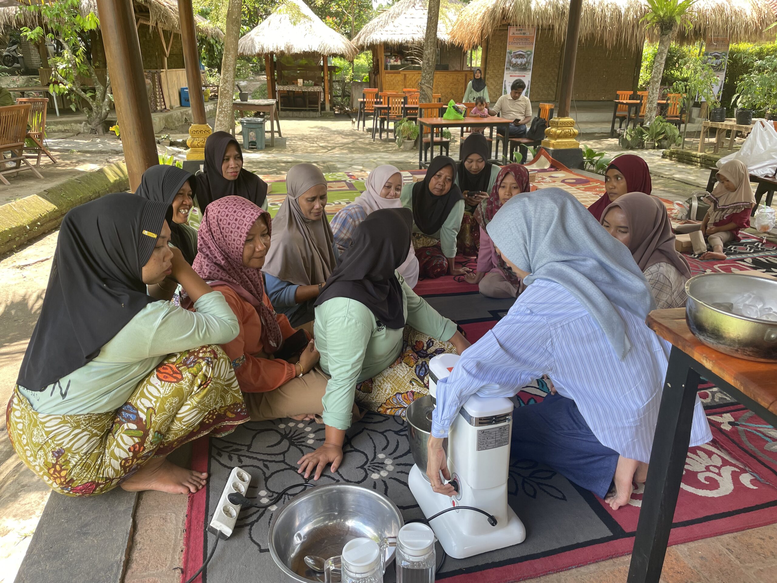 Pada kesempatan kali ini, masyarakat diajak terlibat aktif melalui pelatihan pembuatan mie ayam merangkat, roti ayam merangkat, probiotik kombucha, serta berbagai diversifikasi pangan lainnya. Tidak hanya itu, tim juga membekali peserta dengan pelatihan pengemasan produk agar dapat dipasarkan sebagai oleh-oleh khas Desa Bonjeruk. Peserta kegiatan mencakup ibu-ibu Pokdarwis Bonjeruk Permai, pelaku UMKM, hingga generasi muda desa.